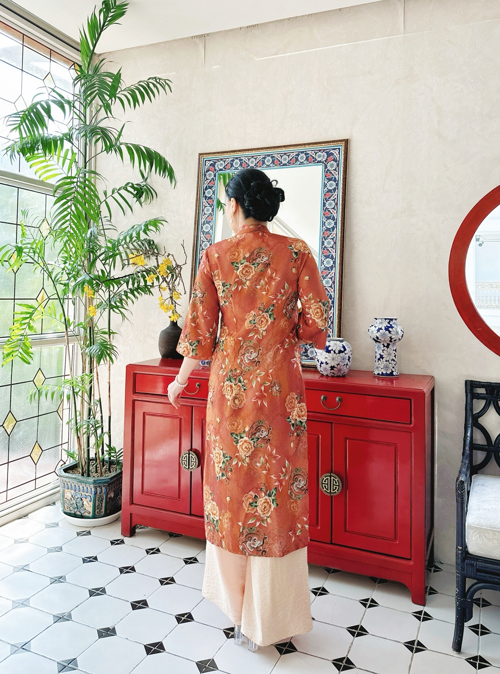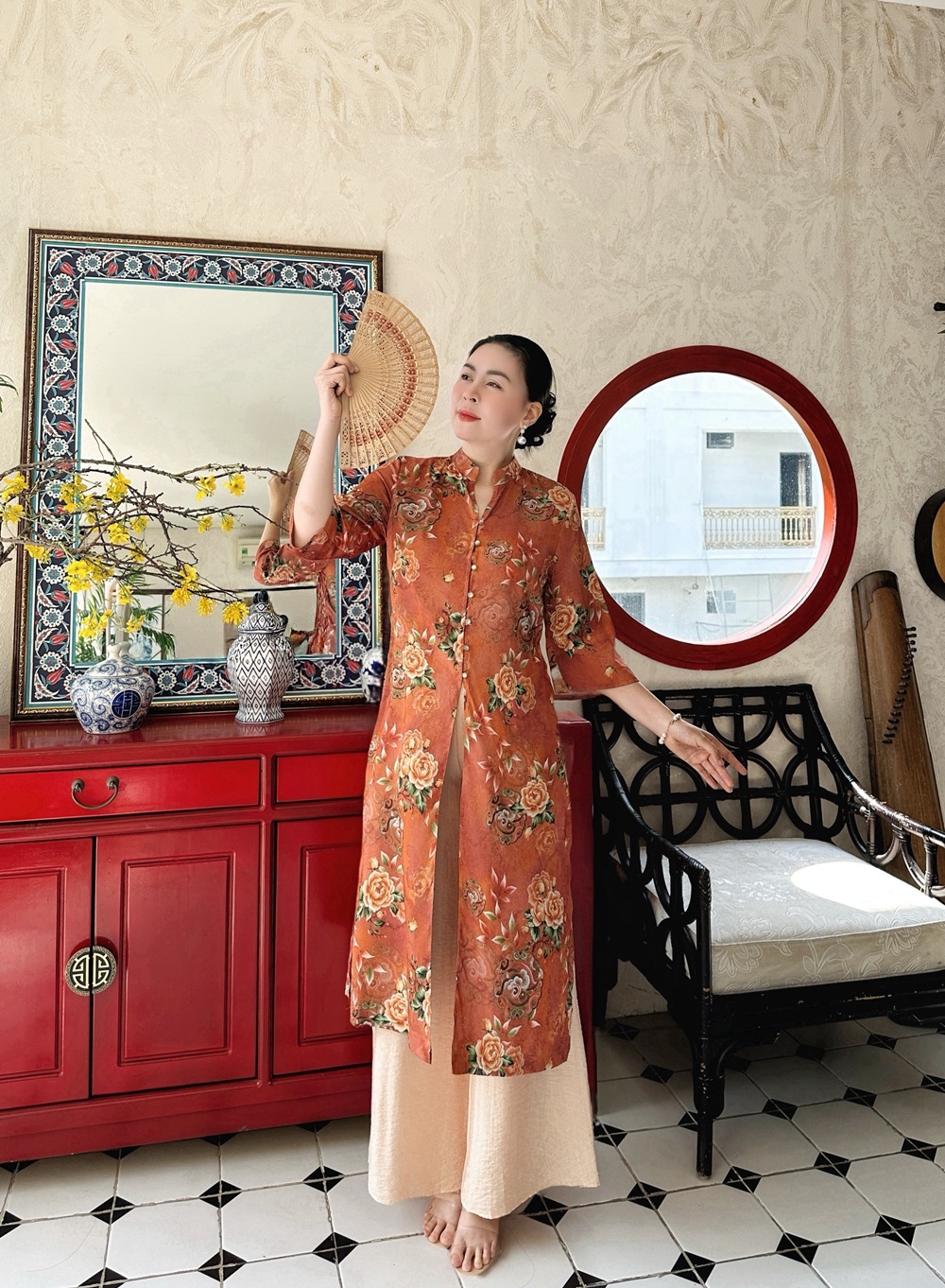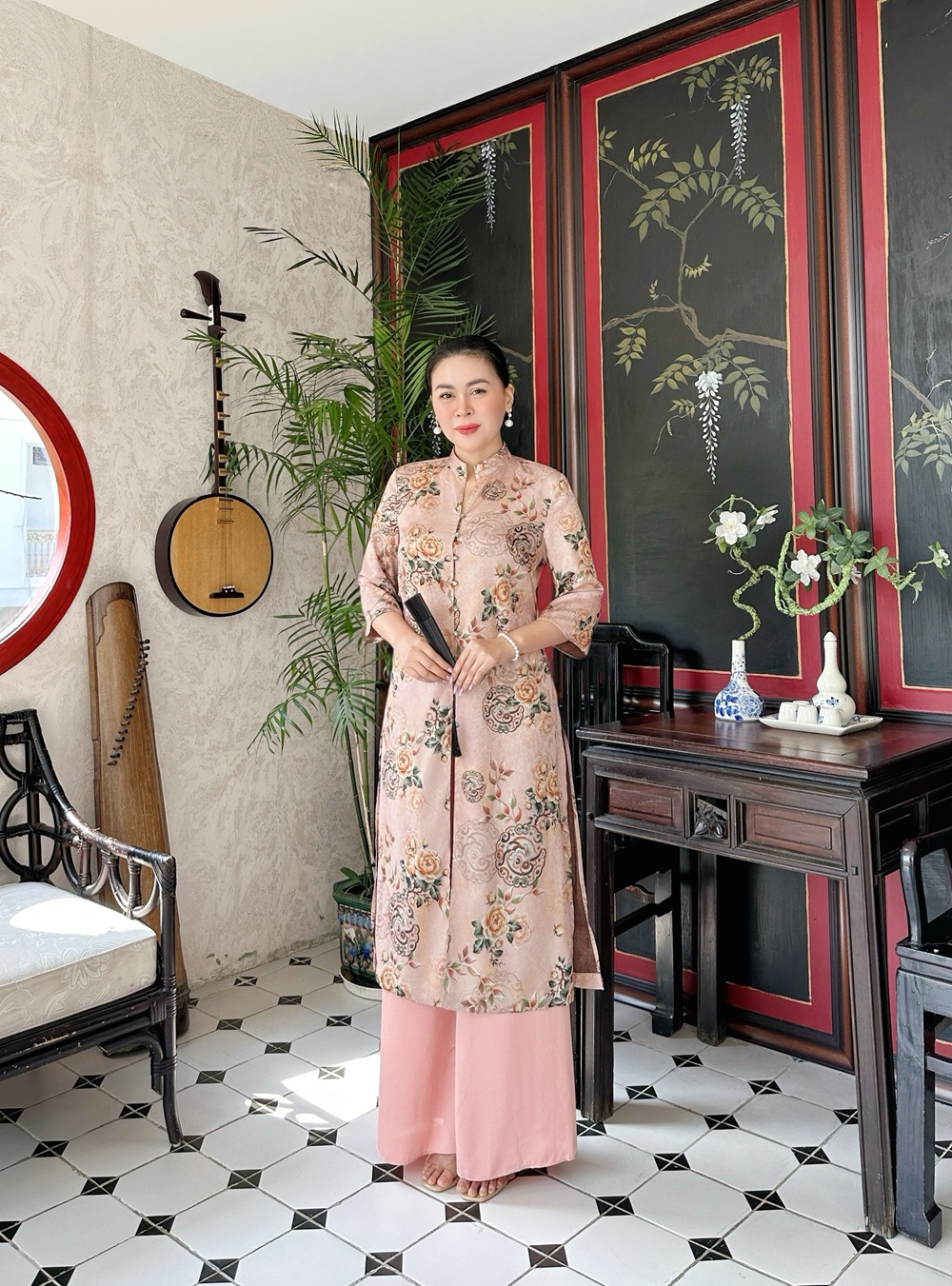ÁO DÀI CỔ TÀU VẢI HOA TẶNG QUẦN