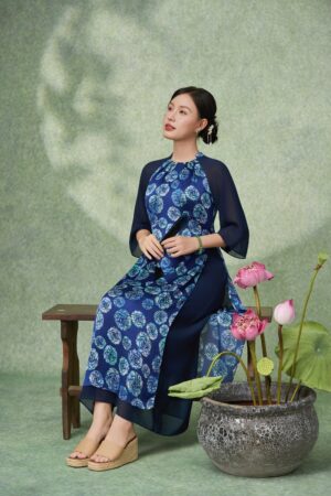 - Kiểu dáng: Áo dài triết eo, cổ tròn, tay lửng