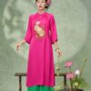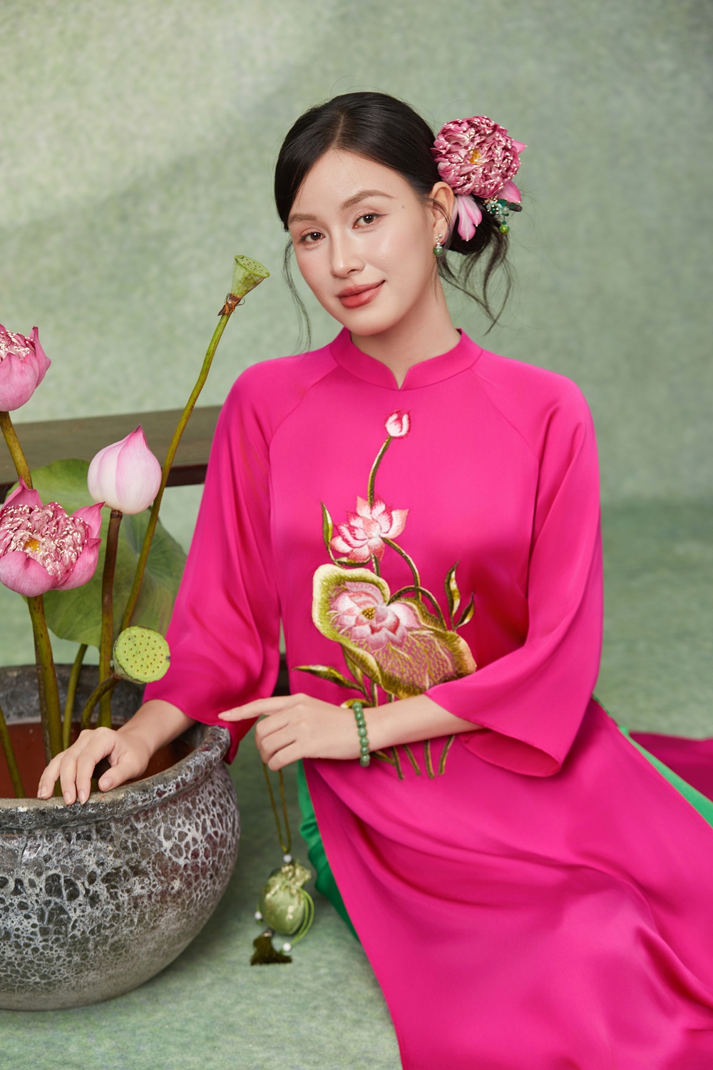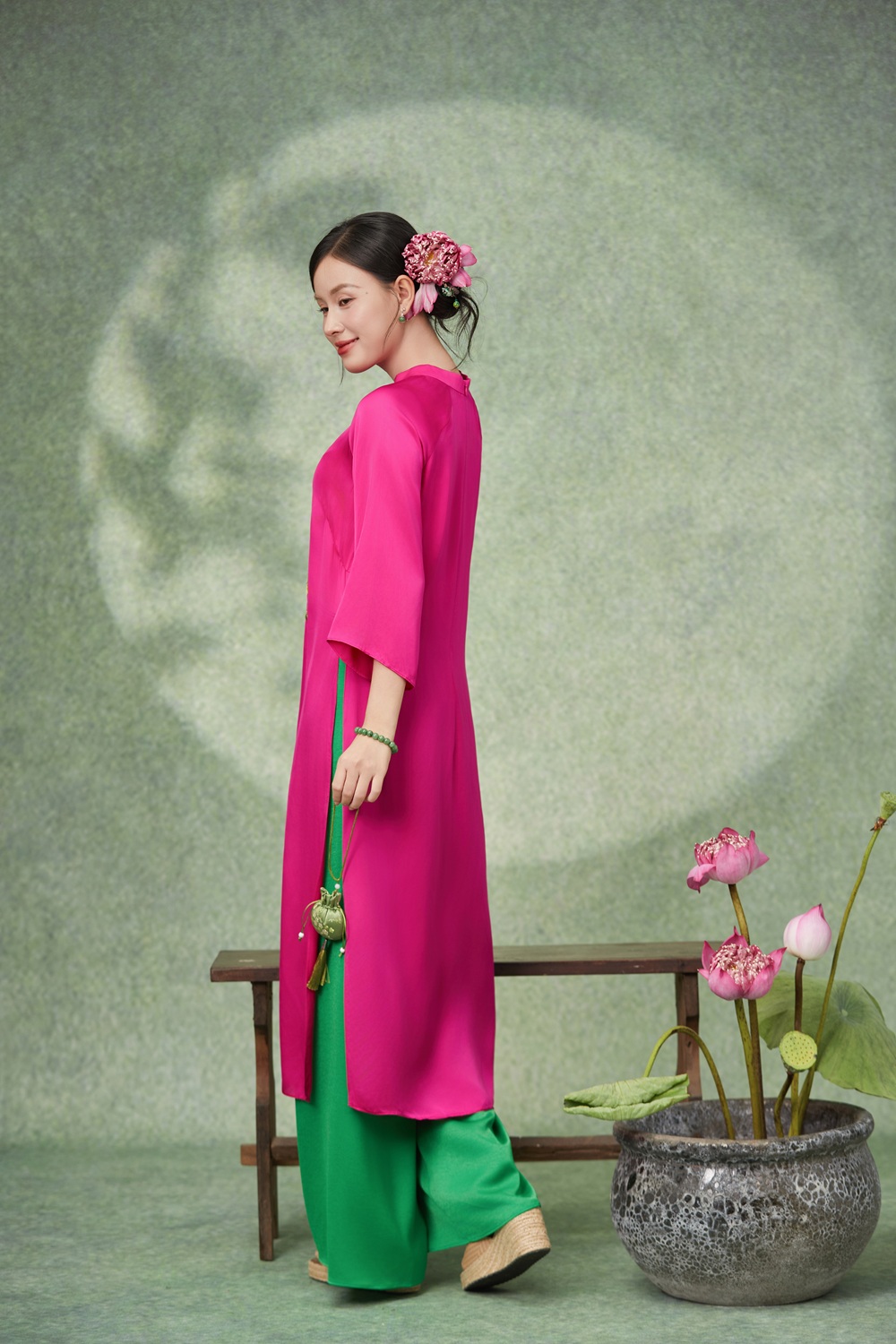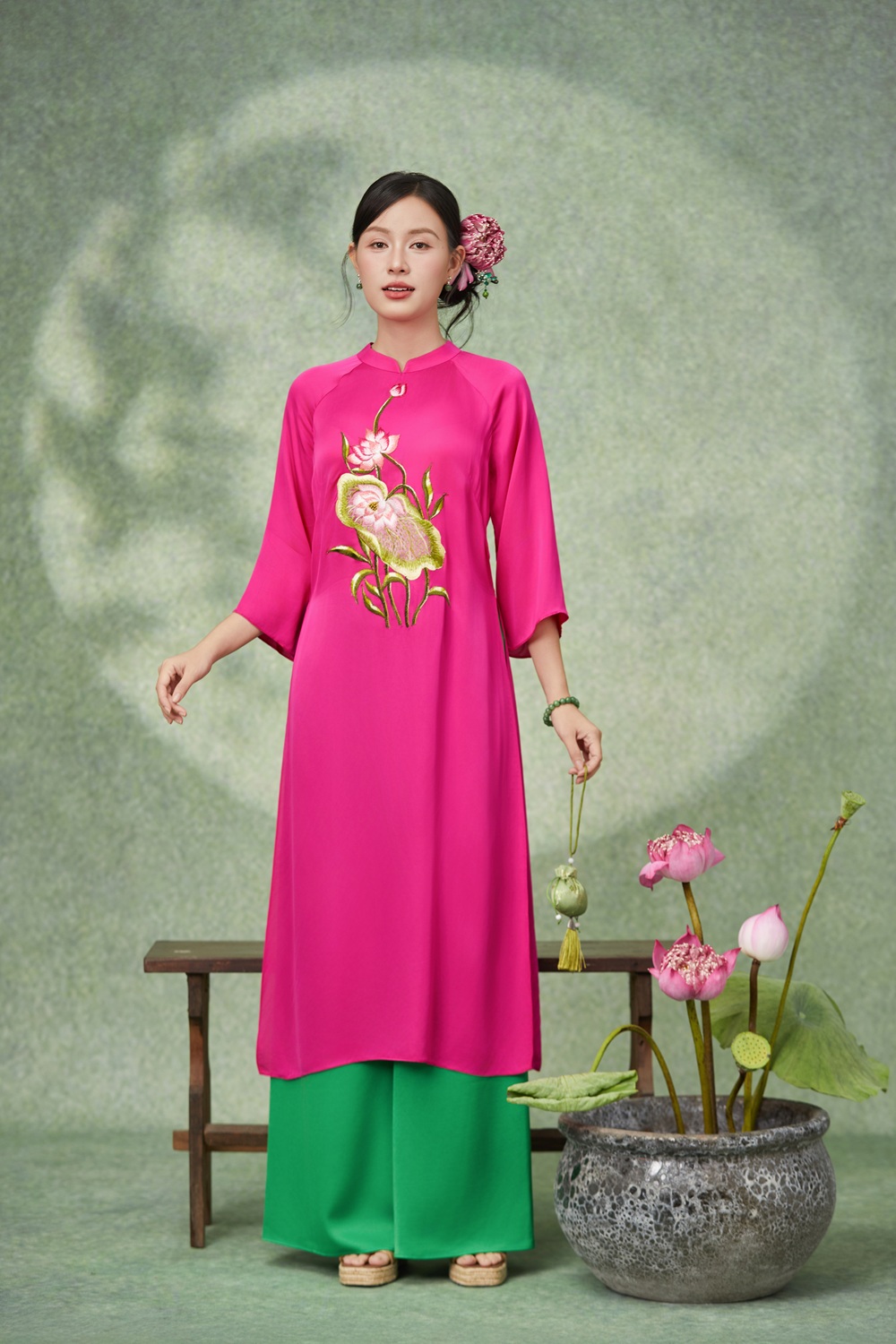 Chiếc áo dài nổi bật với tông Hồng Sen thu hút, tạo hiệu ứng thị giác tràn đầy sức sống. Điểm nhấn nằm ở họa tiết thêu Hoa Sen tinh xảo dọc thân áo, mang đến sự hài hòa giữa vẻ đẹp kiêu sa và ý nghĩa văn hóa truyền thống. Áo kết hợp cùng quần xanh lá mạ tạo sự tương phản đầy cá tính.