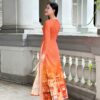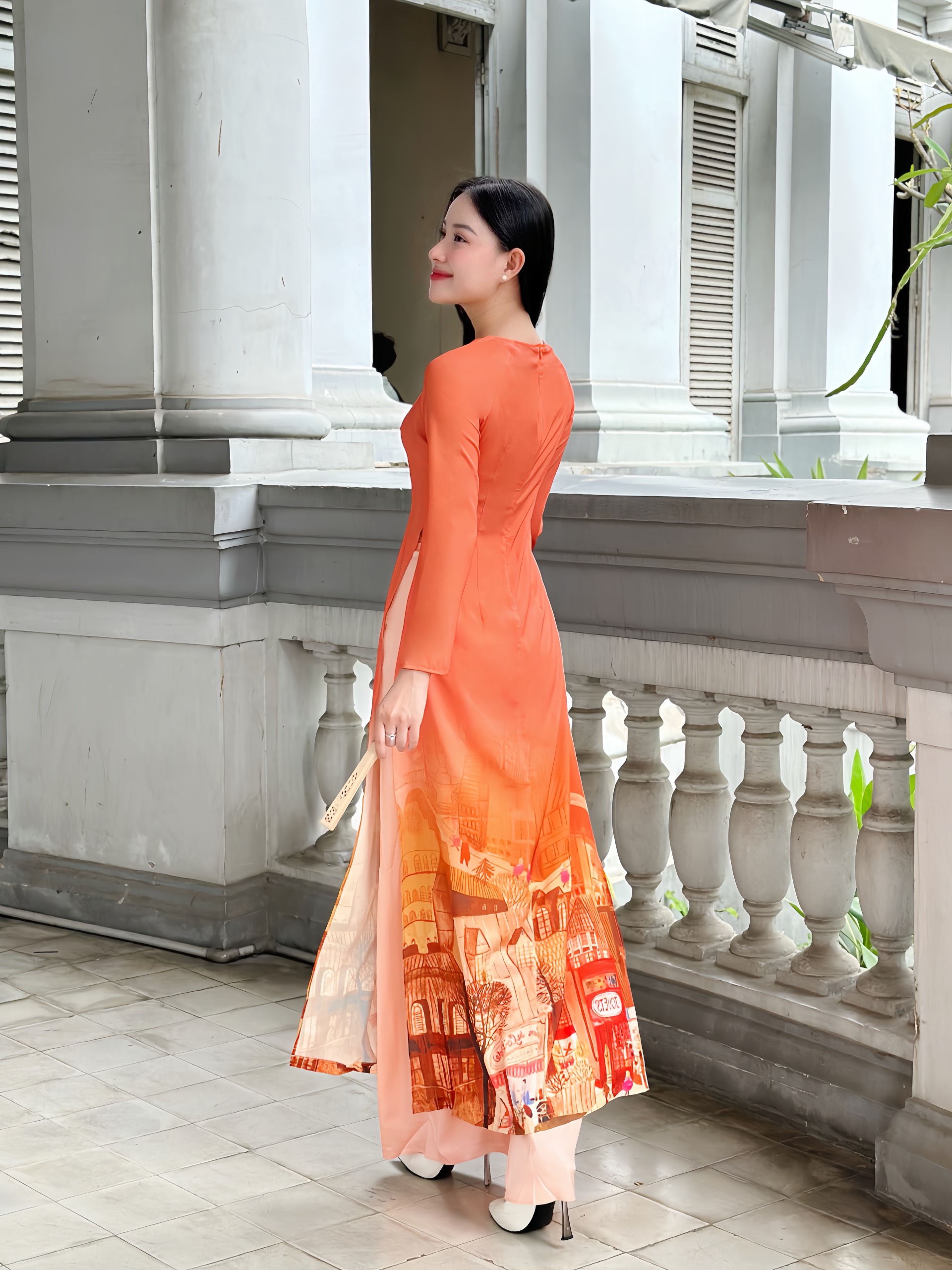 Điểm nhấn nổi bật là phần tà áo dài thướt tha, xẻ cao hai bên hông – chi tiết quen thuộc của áo dài truyền thống, giúp tôn dáng và tạo sự uyển chuyển khi bước đi. Phần tà dưới được in họa tiết phong cảnh đô thị với các gam màu hài hòa, tạo hiệu ứng chuyển màu từ vàng nhạt ở trên xuống.