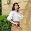 Thiết kế nổi bật với tay áo xếp li lửng cùng chi tiết nhún dọc thân tay, tạo hiệu ứng mềm mại và duyên dáng. Cổ tròn kín đáo với hàng cúc nhỏ xinh tinh tế ở thân trước, vừa dễ mặc vừa tăng thêm nét thanh lịch. Các gam màu pastel tươi sáng giúp gương mặt bừng sáng và mang đến nguồn năng lượng trẻ trung, tràn đầy sức sống.