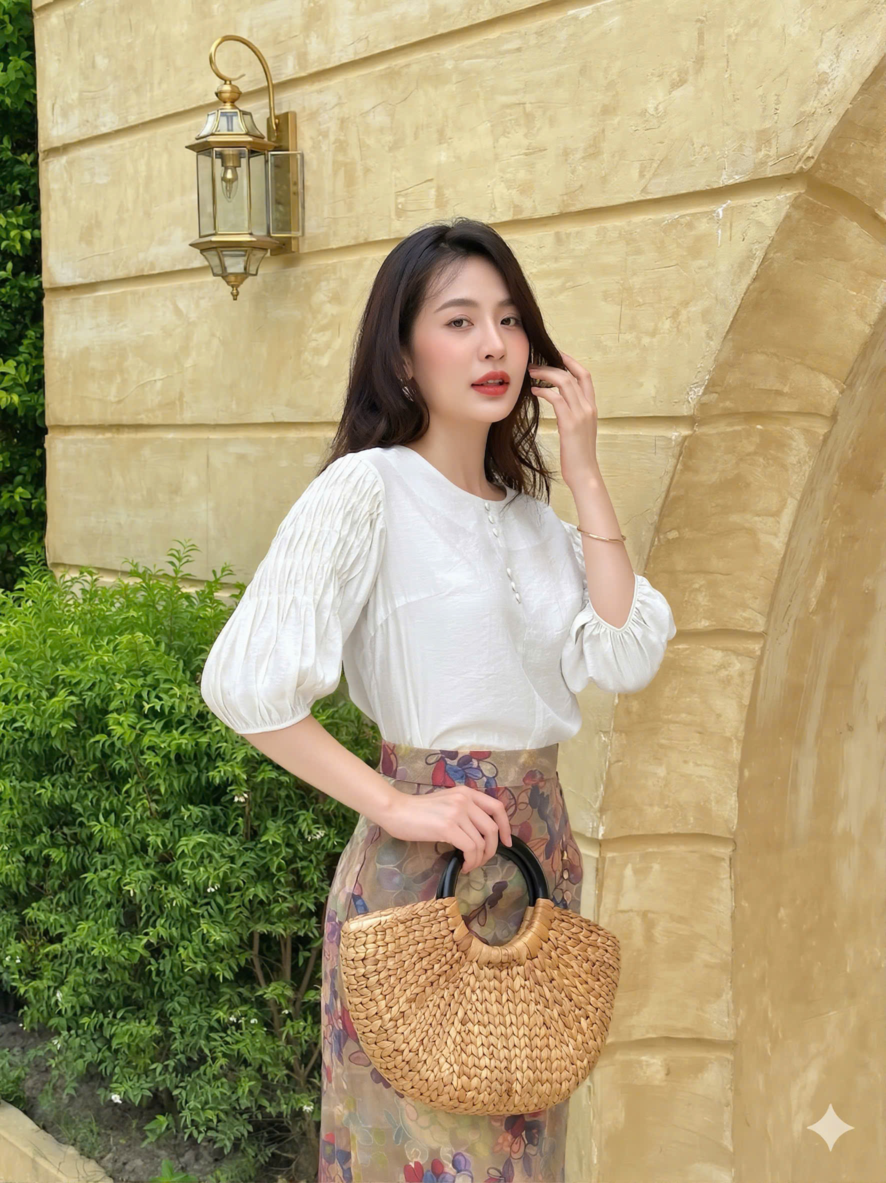 Thanh lịch và ngọt ngào, chiếc áo tơ dáng suông tay xếp li mang đến vẻ ngoài nữ tính và cuốn hút cho người mặc.