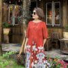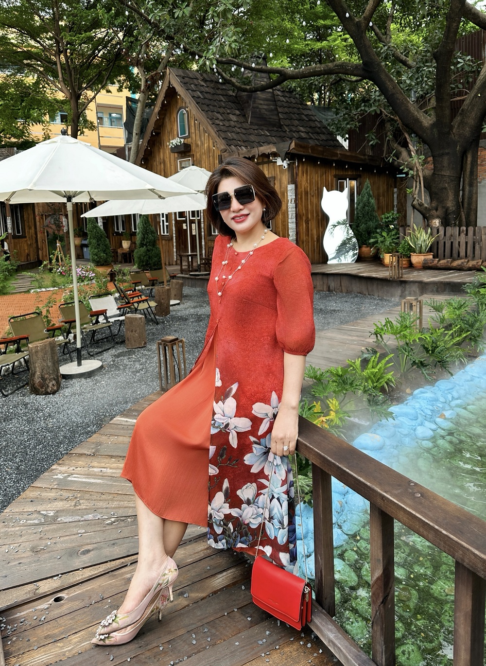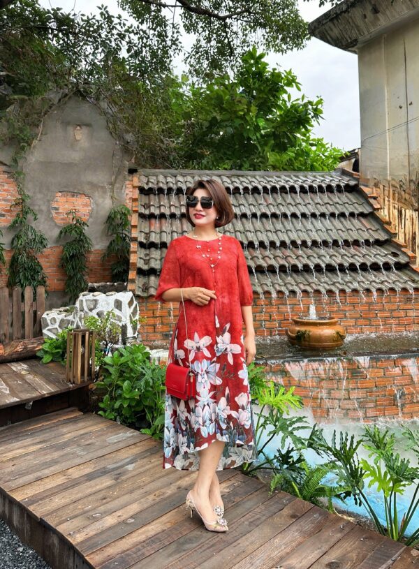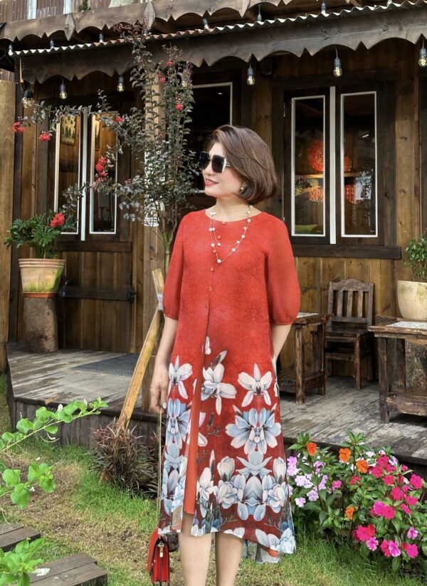 Thiết kế đầm dáng suông nhẹ, mang phong cách thanh lịch và nữ tính. Phần thân trên tối giản với gam đỏ cam nổi bật, tạo cảm giác ấm áp, sang trọng. Thân dưới được phối họa tiết hoa to bản tông trắng xanh mềm mại, tạo điểm nhấn tinh tế và tươi trẻ, giúp tổng thể trở nên nhẹ nhàng mà vẫn cuốn hút.