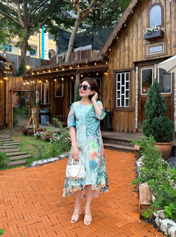 Tay áo phồng nhẹ, độ dài ngang khuỷu mang lại sự thoải mái, phù hợp với nhiều dáng người. Đường xẻ giữa thân trước vừa tạo nét bay bổng vừa giúp bước đi thêm uyển chuyển.