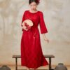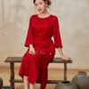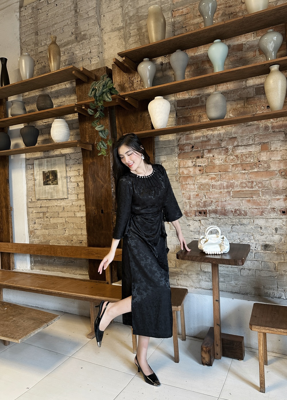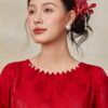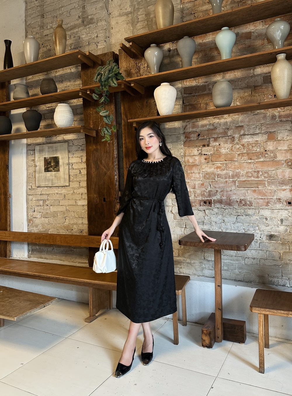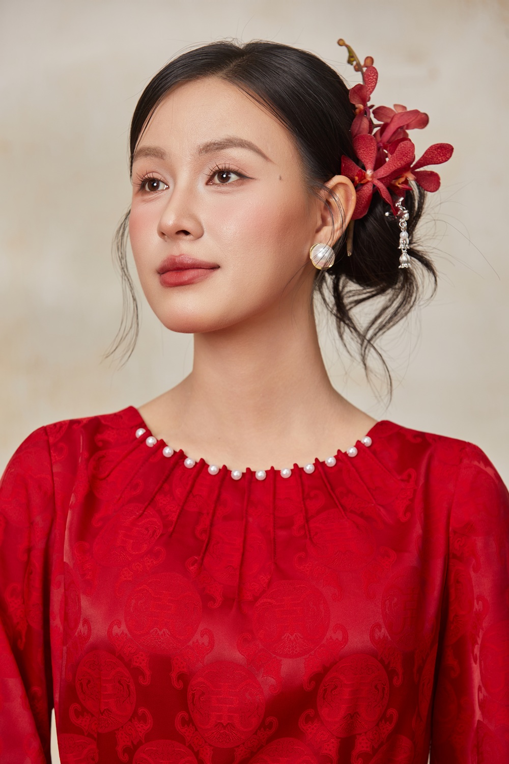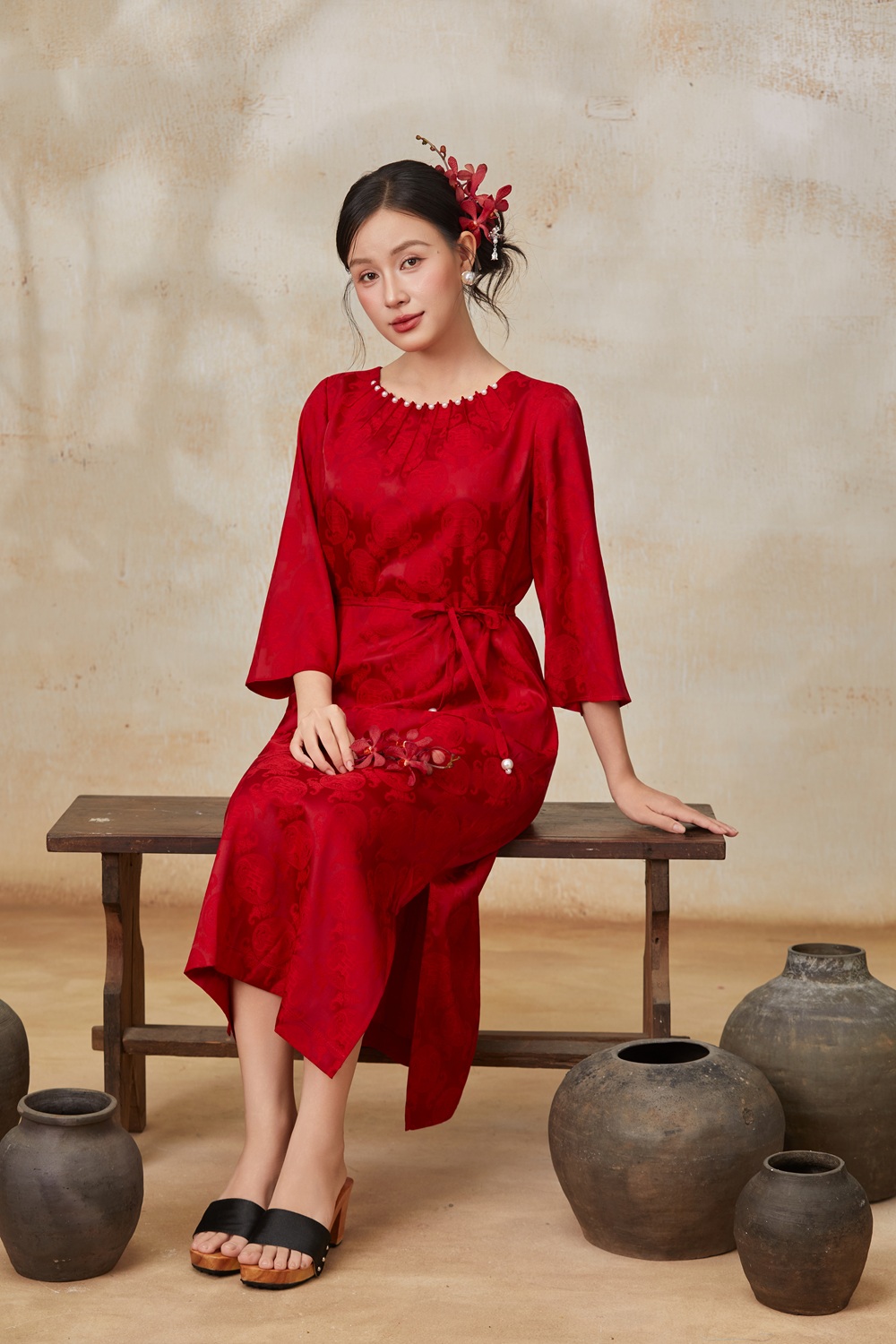 Chiếc đầm được thiết kế trên chất liệu lụa cao cấp, mang sắc đỏ trầm sang trọng và mềm mại. Bề mặt vải có họa tiết dệt nổi tinh tế, tạo chiều sâu và độ bắt sáng nhẹ, giúp tổng thể vừa thanh lịch vừa nổi bật.
