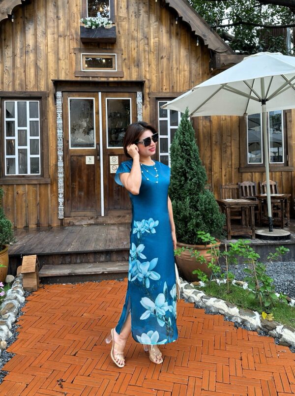 Được may từ lụa organza cao cấp, chất vải có độ bóng nhẹ, mềm mại và thoáng mát, giúp người mặc luôn cảm thấy dễ chịu. Form đầm dáng suông dài qua gối, tay ngắn, cổ tròn, tạo cảm giác thanh lịch và dễ dàng tôn dáng. Họa tiết bông hoa lớn cách điệu ở thân trước là điểm nhấn độc đáo, mang đến vẻ nữ tính và nghệ thuật.